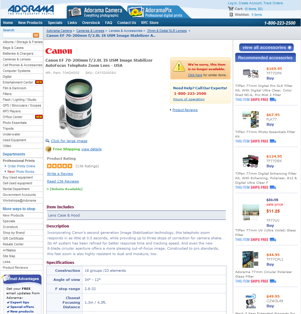 Of course it is discontinued! Who would buy it if there is another product called “Canon EF 70-200mm f/2.8L USM AutoFocus Telephoto Zoom Lens with Case & Hood – USA” http://www.adorama.com/CA70200AFL.html for the same price but with case and hood! All you need to do is press “similar items” on Adorama page.