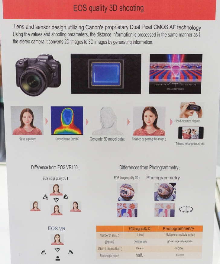 Canon also showed off new software that allows data from DPAF sensors that combine the 3D depth mapping and the sensor images to turn all that into 3D stereoscopic images. This seems to be something that Canon is going to release. Most likely as part of their subscription-based service for Canon VR software. The cool part of that is that it can be performed from one image, whereas 3D photogrammetry can require multiple images from various angles. For the sake of coolness, I included a machine-translated version of the booth display.