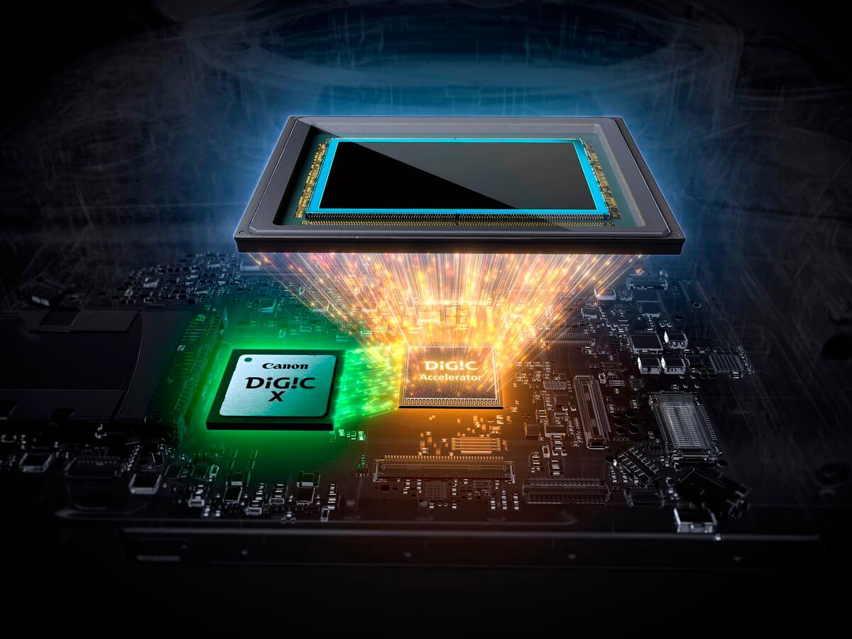 The DIGIC Accelerator chip is a completely new front-end processor developed by Canon to supplement the power of the proven DIGIC X processor. The DIGIC Accelerator handles the processing that makes so many of the new features of this camera possible, allowing the DIGIC X chip to focus solely on image processing, again contributing to incredible speed. The DIGIC Accelerator processes large volumes of data directly from the image sensor for actions like AF detection to exposure metering calculations that enable eye-control focus, subject identification and tracking, and even deep learning with features like neural upscaling and noise reduction.