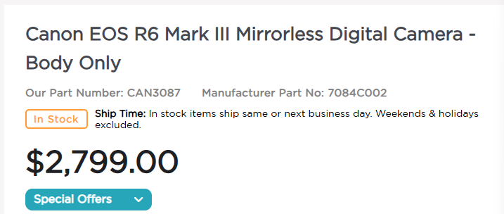 The Canon EOS R6 Mark III is in stock in many places around the globe. This is great news for potential customers, it's nice to be able to wait and see the reviews and not worry that you'll have to wait a month to buy it.