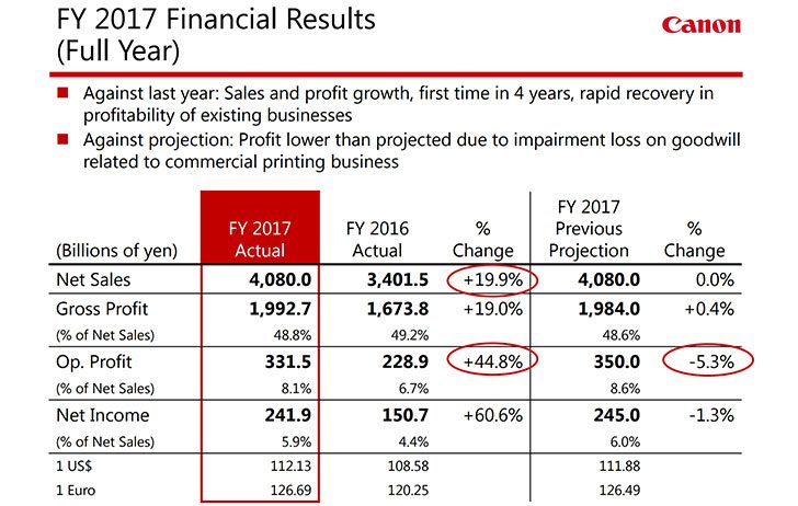 Canon has released their 2017 year end results, and they were quite good for the company. Canon saw a nearly 20% gain in sales and operating income up about $3 billion USD or 44.8%.