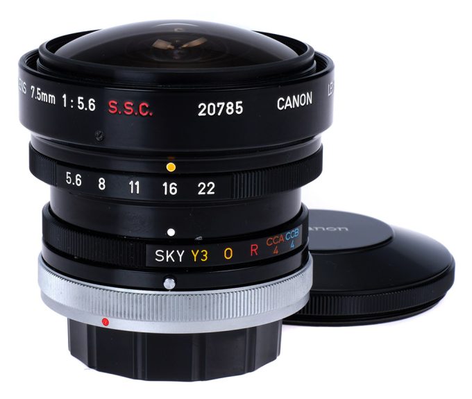 The first Canon lens with the Fisheye designation was the Fisheye FD 7.5mm f/5.6 S.S.C released in February 1973. Oddly enough, the FD fisheyes had the “fisheye” before the mount identifier, something only found with the Fisheyes. I guess Canon thought they were special.