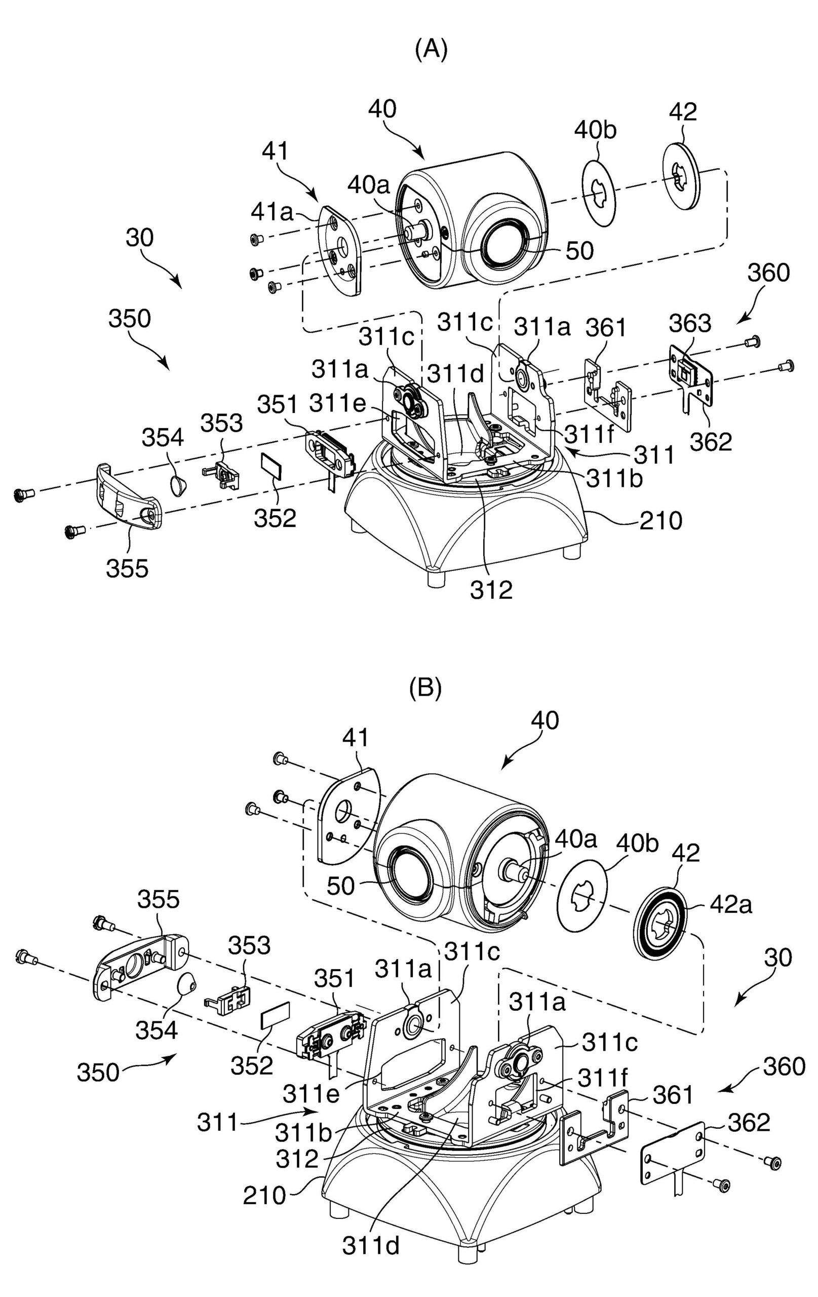 In particular, in order to finely control the rotation in the tilt direction, it is necessary to greatly reduce the rotation of the motor, so that a plurality of pulleys and timing belts are required, and the tilt drive mechanism becomes large. As a result, the image pickup device consisting of the camera and the rotation drive mechanism also becomes large, and the degree of freedom of mounting on the handlebar of the drone or bicycle may be reduced, and in particular, the weight of the image pickup device may exceed the maximum load capacity in the drone. ..