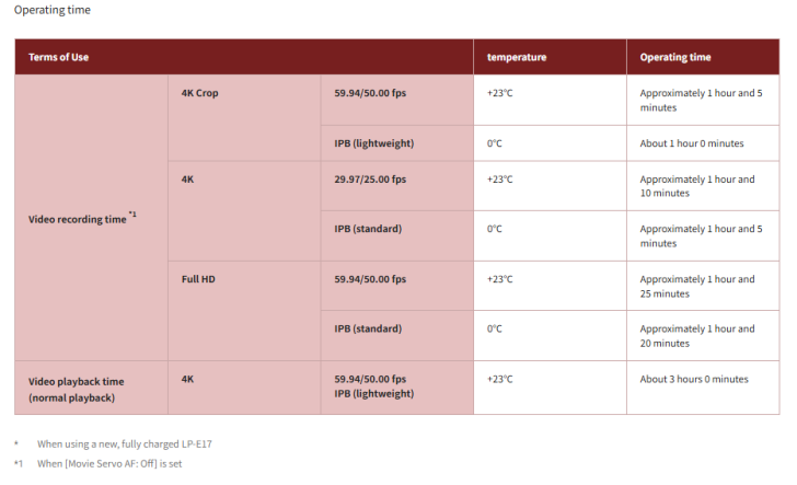 However, Canon has listed the recording times as being far more conservative. There is no mention if this with the overheat set to high. I suspect this is with the camera set to normal overheat operation.