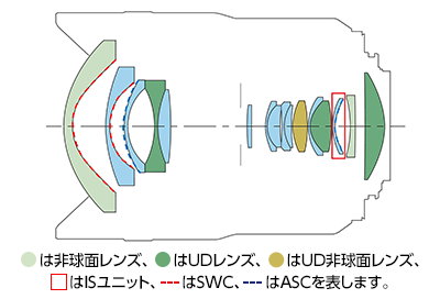 Translated roughly: The Light Green elements are aspherical elements, the dark green elements are UD elements, and the olive-colored element is UD Aspherical. The red Square encapsulates the IS element.