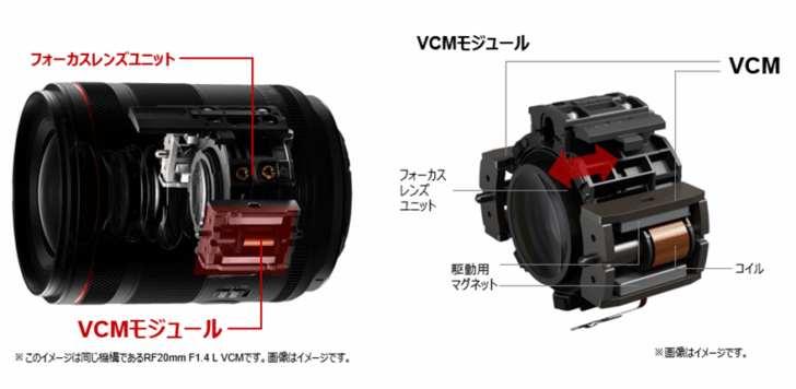 Additionally, the diagram shown by Canon for the 85mm f/1.4 lens, although the illustration used is of the 20mm VCM lens, Canon states that it utilizes the same autofocus drive as the 85mm. The drive utilizes two voice coil drive actuators, located on either side of the focus element group assembly, to drive the autofocus.