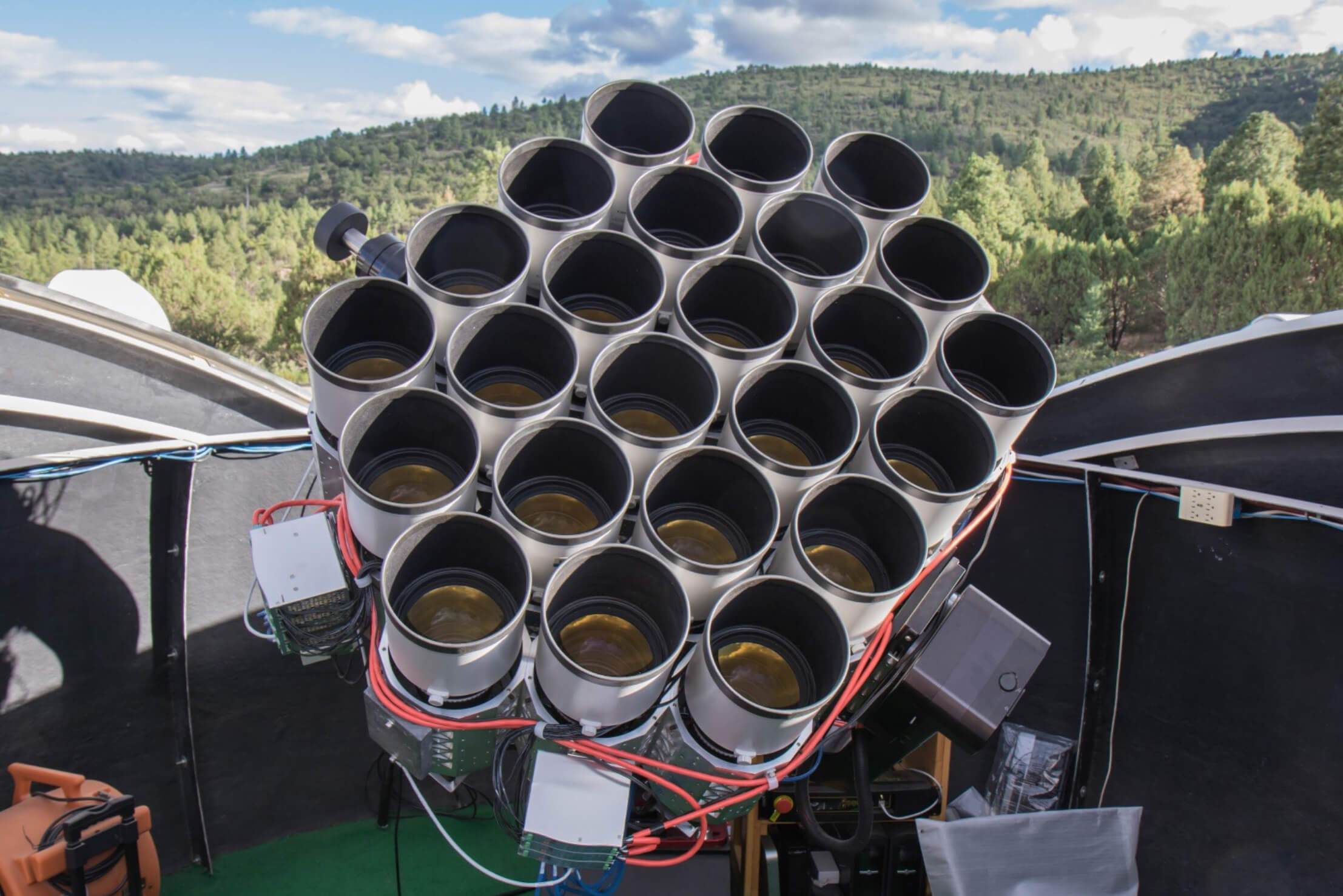 The Dragonfly Telephoto Array is a telescope array equipped with multiple Canon large-aperture super-telephoto single focal length lenses – specifically, the Canon EF 400mm f/2.8L IS II USM lens. The telescope was designed in 2013 by Project Dragonfly, an international research team from Yale University and the University of Toronto. The Dragonfly Telephoto Array is capable of capturing images of galaxies that are so faint and large that they had escaped detection by even the largest conventional telescopes. Its mission is to study the low surface brightness universe to elucidate the nature of dark matter and to utilize the concept of distributed telescopes.
