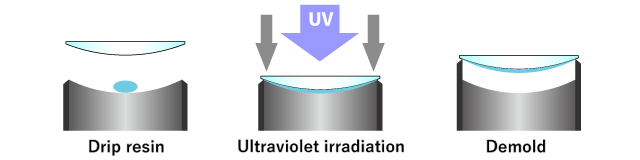 GMo aspherical lens elements are manufactured by softening glass material under high temperatures and then shaping it using a molding machine. These elements are suitable for large quantity manufacturing, the resulting lens element retains the scratch- and heat-resistant properties of glass.