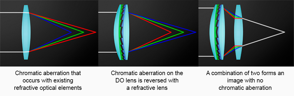 Diffractive Optics (DO) elements use microscopic gratings etched into glass to diffract light, correcting chromatic errors. Unlike refractive lenses, DO elements enable super-telephoto lenses up to 50% shorter than traditional designs. Multi-layer DO stacks gratings to minimize flare and align wavelengths.Â