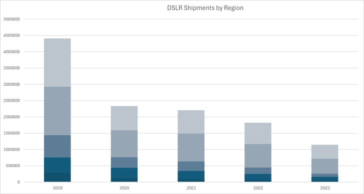 When we look at DSLR numbers over the past 5 years we see why Nikon seems to be retreating from the market as much as possible, and why Canon is discontinuing whatever they can manage. Both Canon and Nikon may have had different ideas, but COVID-19 dropped a grenade into those plans. DSLRs are still shipping in respectable quantities, but only to just the Americas and European markets. Even in those markets, DSLR shipments are just a shadow of past successes.
