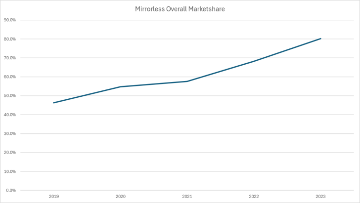 Keeping with that thought, Mirrorless went from being in a competitive race to completely dominating the market in the last 5 years. Mirrorless shipments now are around 80% of all interchangeable lens cameras.