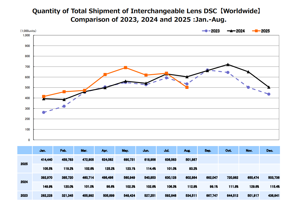 Okay, but it's not all bad. Year on year, the shipments of cameras remain higher than in 2024, but we are starting to see a downward trend, and it's unclear where it will stop. I had long thought that this year's CIPA data would be difficult to predict, and we may not even know the final results until January 2026.