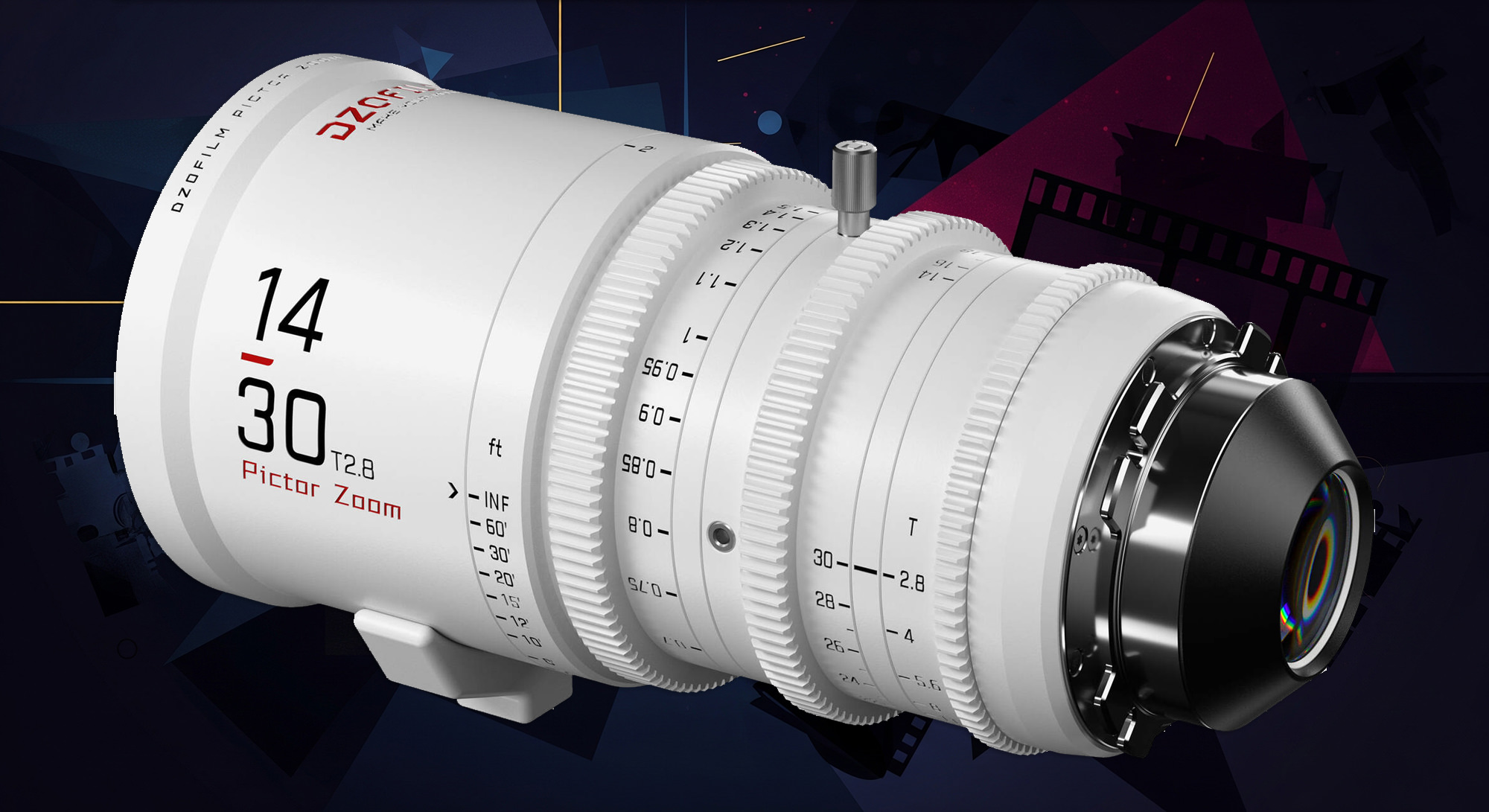 The white Pictor 14-30mm T2.8 Super35 Parfocal Zoom Lens from DZOFilm features a relatively fast maximum aperture of T2.8 with an aperture range of T2.8 to T22, and it adds an extreme wide-angle zoom to the Pictor line of lenses.