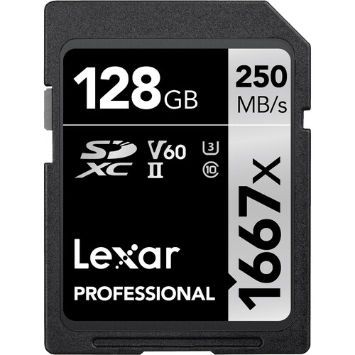 The 128GB Professional 1667x UHS-II SDXC Memory Card (2-Pack) from Lexar features a storage capacity of 128GB per card and takes advantage of the UHS-II bus to support advanced DSLR functions such as continuous shutter bursts and rapid shooting, as well as raw and JPEG captures. This card is also well-suited for video capture, including 4K, 3D, and Full HD video, and can achieve maximum read speeds of up to 250 MB/s and maximum write speeds of up to 120 MB/s. Thanks to its V60 speed class rating, minimum write speeds are guaranteed not to drop below 60 MB/s.