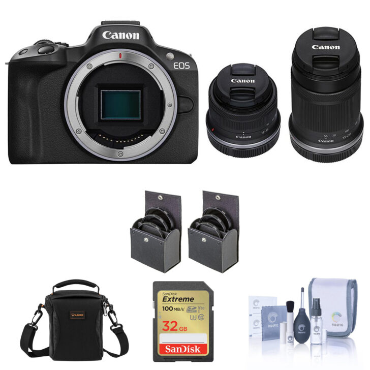 A small camera bag, filters and an SD card is a great starting bundle with the already good Canon EOS R50 dual lens kit with the 18-45mm and the 45 to 180mm RF-S lenses.