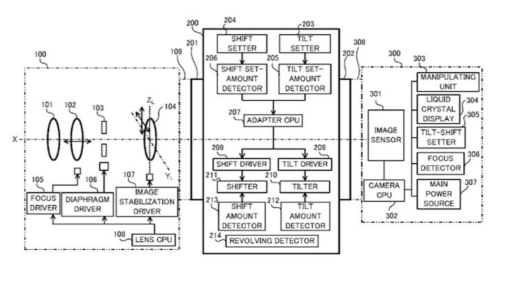 First off, the Canon Tilt-Shift Adapter has its own CPU inside and no optics. But it works hand-in-hand with the Canon EOS body and EF lenses to not only serve as a pass-through for communication but to also take on some processing burdens to make tilt-shift work on different cameras and lenses. Additionally, there are motorized drivers inside of the adapter that can drive the shift and tilt axes using controls on the camera (or the adapter itself). Read the full breakdown of the patent