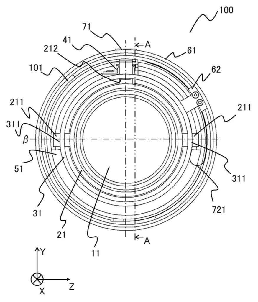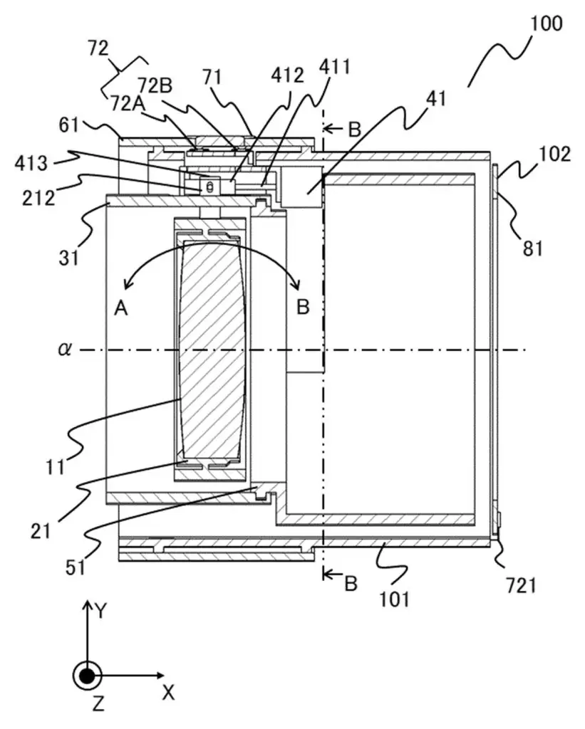 - The drive unit 41 is fixed at a position on the outer periphery of the guide cylinder 31 at a position orthogonal to the tilt axis β from the optical axis α. The drive unit 41 is a motor (actuator) having a lead screw 411 that rotates around an axis parallel to the optical axis α, and generates a driving force that tilts the holding frame 22. The guide cylinder 31 is held by the fixed cylinder 51 so as to be rotatable around the optical axis α by bayonet coupling.