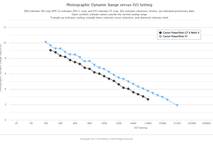 I know some will suggest that Canon is doing noise smoothing and reduction, which is why you see the triangles with the V1; however, that’s never been a definitively proven scenario, and could have more to do with the fact that the sensor is dual pixel and requires some image processing in the image pipeline, versus a deliberate occurrence of noise reduction to boost DR values.
