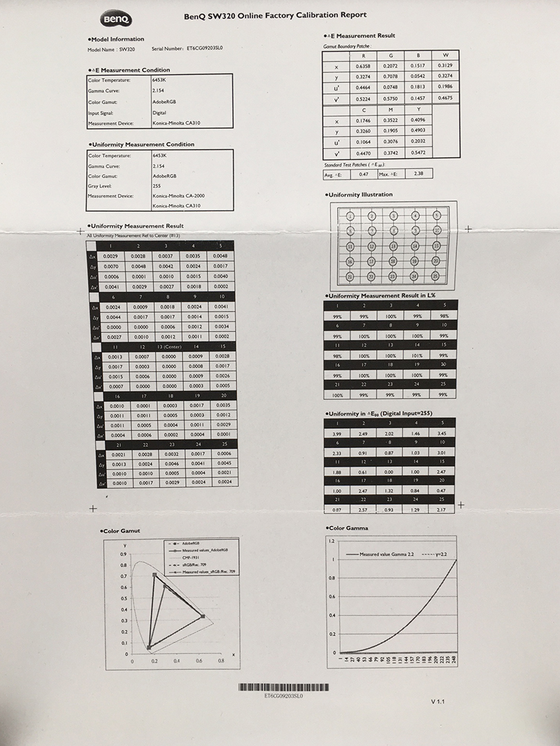 Every single BenQ SW320 ships with an online factory Calibration Report. This detailed report includes some very useful information including Uniformity Measurements and Dealt E reports that tell you just how your individual SW320 performed when tested before it left the factory. It is worth noting that the report is serial number specific and not batch specific so BenQ are testing each and every monitor. These sort of reports are normally only found in much more expensive displays such as those from the NEC SpectraView Line and the Eizo Colour Edge monitors. The mere fact the BenQ SW320 ships with this sort of individual test report speaks volumes to the sort of high quality display BenQ have produced and the care and attention to detail they have invested in this new display. A copy of the individual calibration report included with the supplied SW320 as tested is included below: