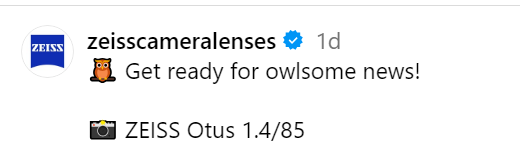 Half a year ago, a guy I know who works for Zeiss in PR (and was also involved in marketing for the unfortunately failed ZX1) told me Zeiss is bringing out new lenses in a few months. Now if you look at zeiss imaging on instagram they are teasing something with an owl, so I guess it might be something Otus line related. May guess is an Otus line for mirrorless cameras as E-Mount and the like.
