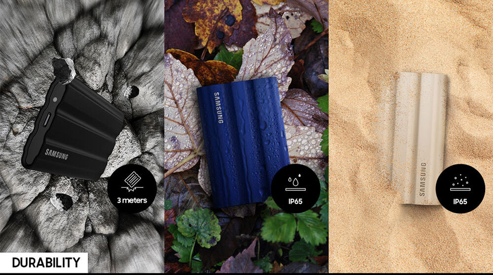 The Shield line of T7 external SSD's are Samsung's rugged version of their external drives. They can handle a 3m drop and are IP65 raited to withstand sand and water.