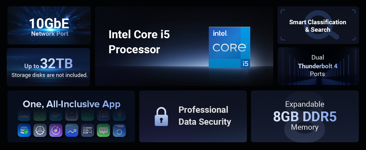 - All-Flash, 32TB Massive Data Storage: Equipped with four M.2 NVMe slots for SSD, this all-flash NASync offers blazing fast read/write speed and has a maximum storage capacity of up to 32TB. And supports JBOD/Basic/RAID0/RAID1/RAID5/RAID6/RAID10 RAID levels. Store thousands of HD movies, pictures, and documents, Making NASync a movie library, photo album, and file storage space all in one.