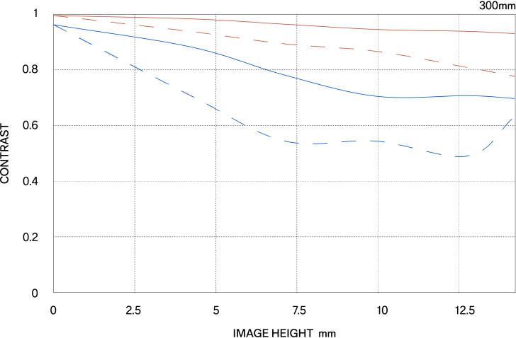 The 300 mm MTF looks very similar to the 16mm MTF, which gives me a good feeling that the lens may have consistent performance throughout the zoom range.