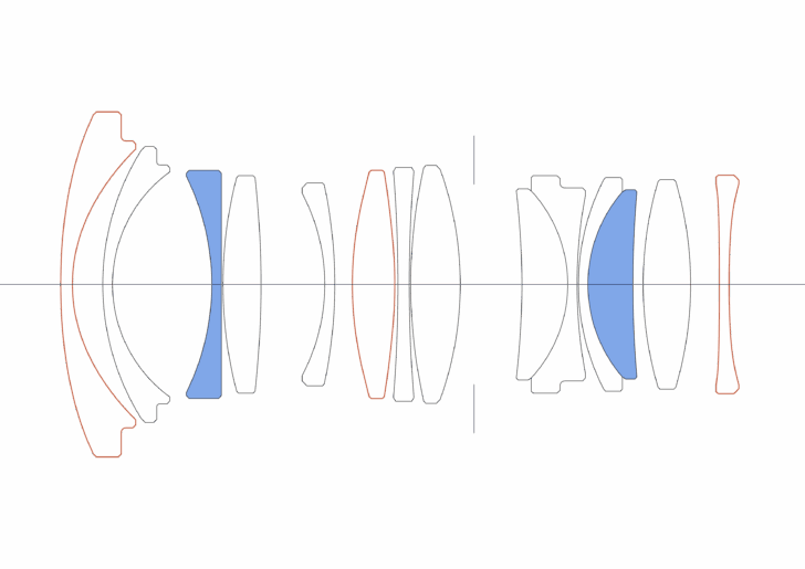 This is a surprisingly complex lens – certainly worthy of its price tag. Sigma has managed to cram 14 elements in 12 groups into this lens, and the effort shows in the MTF. This lens packs in 3 aspherical elements (outlined in red) and 2 SLD (super low dispersion) elements (the elements in blue) to aid in controlling aberrations.