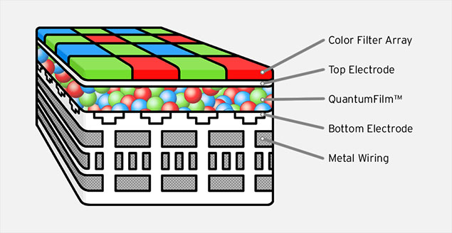 QuantumFilm is a photosensitive layer that relies on InVisage’s newly invented class of materials to absorb light; specifically, the new material is made up of quantum dots, nanoparticles so small that, once they are synthesized, they can be dispersed to form a grid. Just like paint, this dispersion of solid materials can be coated onto a substrate and allowed to dry.
