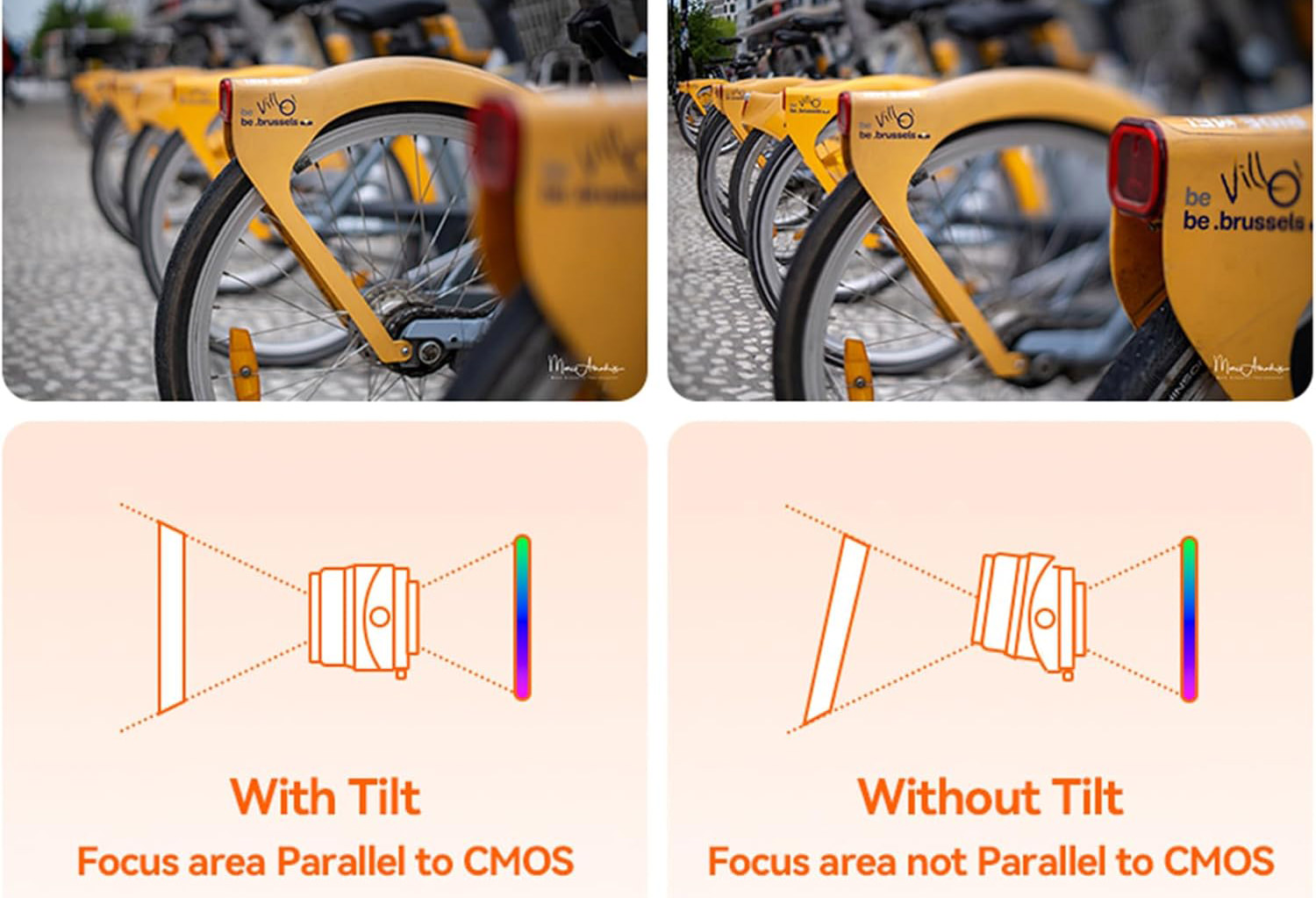 Focus Area not Parallel to CMOS: With the tilt function of a tilt lens, even at the same aperture, you can achieve sharp focus on diagonally positioned or receding subjects, delivering greater control over the plane of focus.